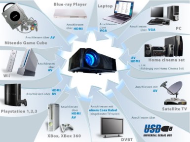 Mit einem Kontrastverhältnis von 1000:1 und einer unterstützten HDMI Auflösung von bis zu 1920 x 1080 (1080p) ist dieser kompakte Beamer für zahlreiche Anwendungen die richtige Wahl. Die Bildhelligkeit von 2000 ANSI-Lumen sorgt für klare Bilder, auch bei Tageslicht und erreicht eine maximale Projektionsgröße von bis zu 5,25m diagonale. Das Bildseitenverhältnis kann auf 4:3 oder 16:9 eingestellt werden. Eingebaute Surround-Lautsprecher sorgen für guten Ton. Zahlreiche Anschlussmöglichkeiten (HDMI, VGA, S-Video, Composite, USB) bringen nahezu alles auf die Leinwand was Bilder macht. Der integrierte TV-Tuner (entweder analoges Kabel-TV oder DVB-T) sorgt für Fernseh-Sendungen ohne zusätzliches Empfangsgerät. Eine starke DVB-T Antenne mit 4m Kabel, bzw. 25m Antennenkabel gehören genauso zum Lieferumfang, wie ein S-Video Kabel, ein VGA-Kabel, ein HDMI-Kabel und ein Cinch-Kabel mit Scart-Adapter. Stromanschlusskabel und Fernbedienung sind selbstverständlich.